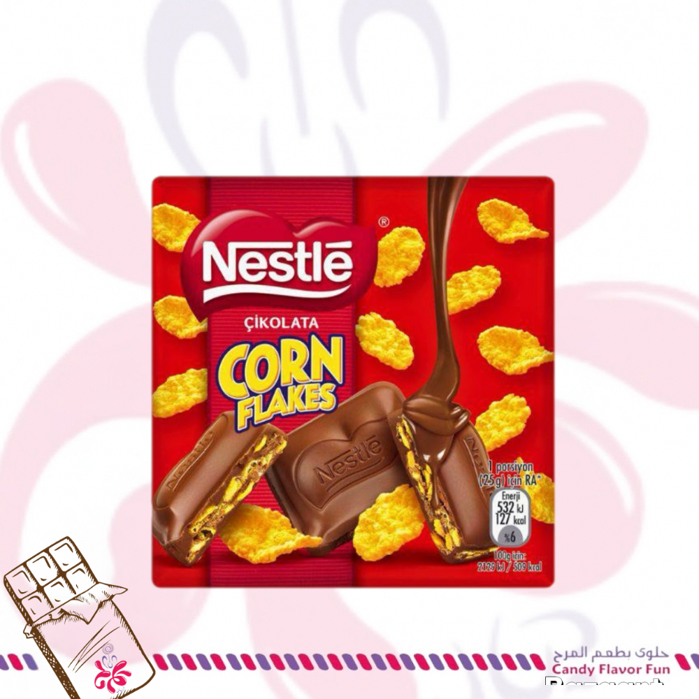 المنتج: نستله لوح شوكولاتة كورن فليكس. الوزن: 60 جرام. القيمة الغذائية لكل 25 جرام (حصة واحدة): 532 كيلو جول / 127 كيلو كالوري. القيمة الغذائية لكل 100 جرام: 2429 كيلو جول / 509 كيلو كالوري.